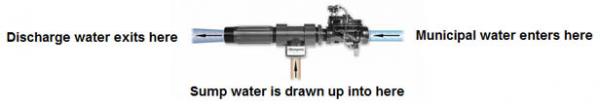 - Uses water pressure from your existing water supply to remove water from the sump.